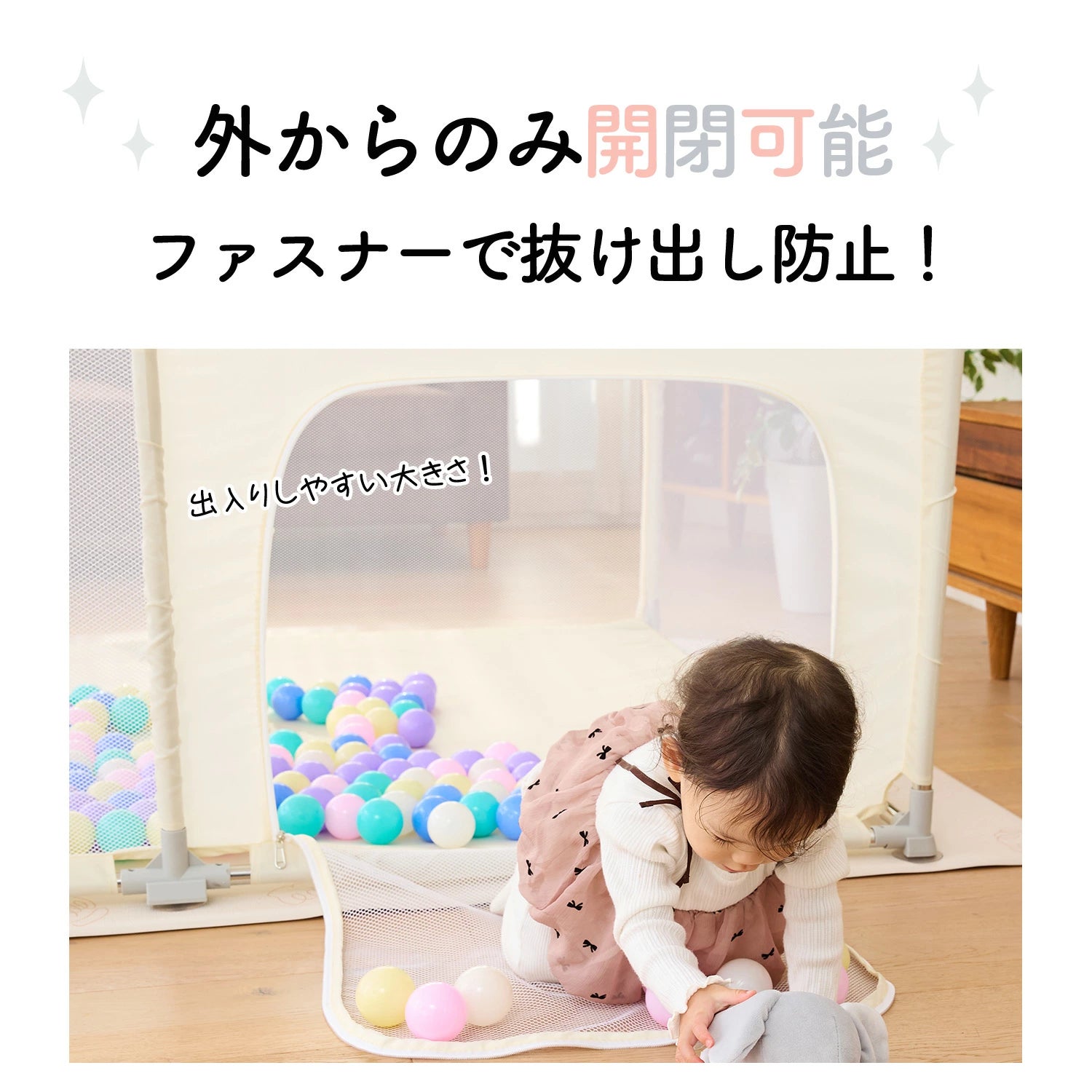 出入り口のドアは、外側からしか開けられない「外開き窓ファスナー」仕様。お子様が内側から勝手に開けて外へ出てしまう心配がなく、料理や掃除などの家事中も目を離さず安全に過ごせます。