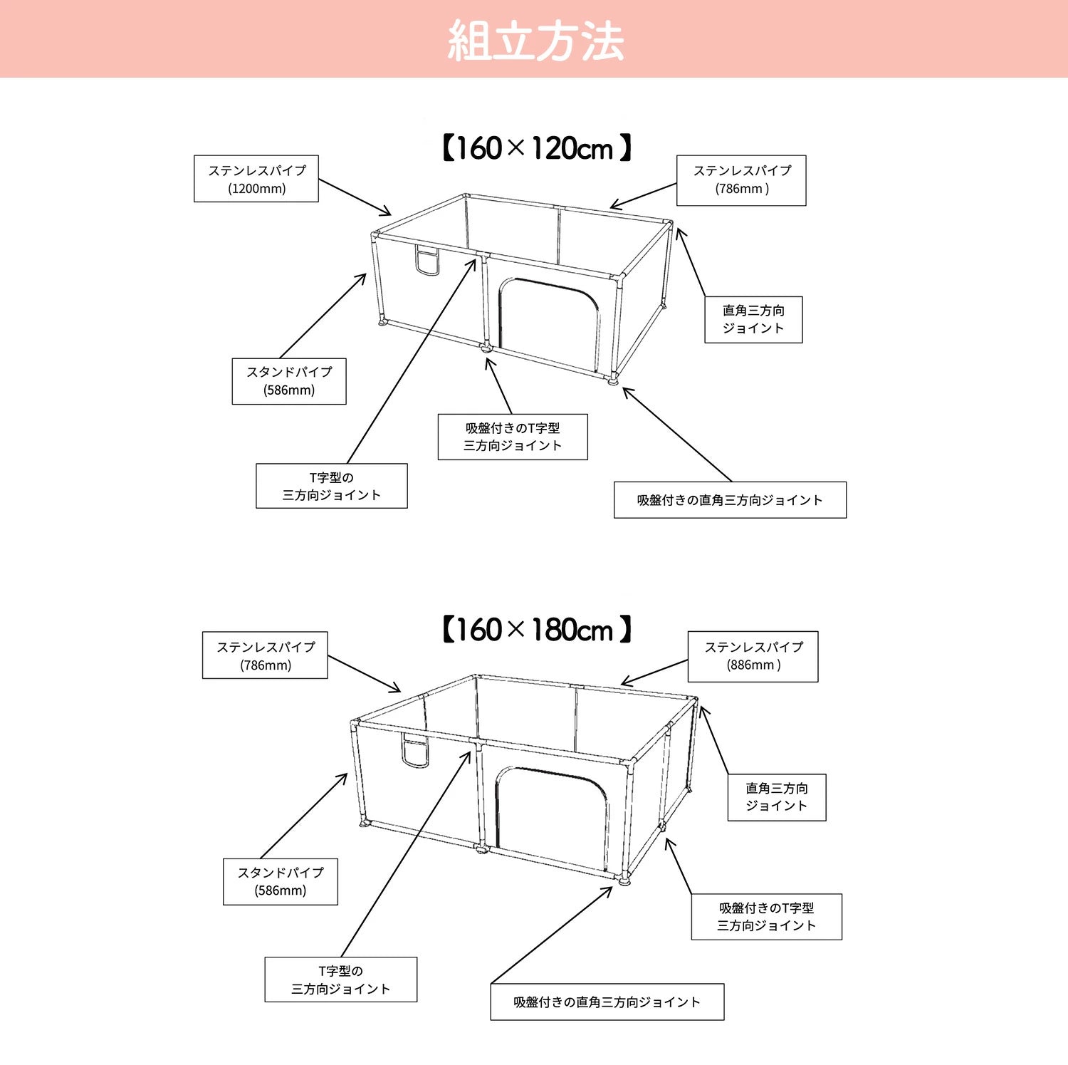 | ご使用上の注意 | ・製品設置後は、赤ちゃんがベビーサークルに登らないように、必ず大人の監督下で使用してください。 ・製品の組み立ては、必ず大人が行ってください。 ・組立手順に従って正確に組み立てて使用してください。 ・部品が破損・欠落している場合には当店までご連絡ください。 ・締め具が緩んでいたり、欠けていたり、接合部が緩んでいたり、部品が破損していたりする場合は、本製品を使用しないでください。組み立て前および使用中に定期的に点検してください。 ・製品に不具合がある場合は、直ちに使用を中止してください。 ・ベビーサークルおよびベビーサークルの部品を使用しないときは、お子様の手の届かないところに保管してください。 ・本来の用途以外には使用しないでください。 ・屋内用の製品です。傾斜のない平らな場所で使用してください。 ・ご使用の際は吸盤を床に吸着させてご使用ください。床の形状により吸盤がつきにくい場合があります。あらかじめご注意ください。 ・製品を火気に近づけないでください。 ・手や足を挟まないようにご注意ください。 ・お子様が本体に入っている状態のまま移動させたり持ち上げたりしないでください。 ・窒息事故を防ぐため、窒息につながる恐れのあるものを置かないでください。 ・お子様が踏み台にできるものをベビーサークルの近くに置かないでください。 ※上記の警告・注意をご理解、ご了承いただいた上、安全に注意して正しくご使用ください。誤った設置とご使用方法により生じた事故につきましては、弊社は責任を負いません。 |