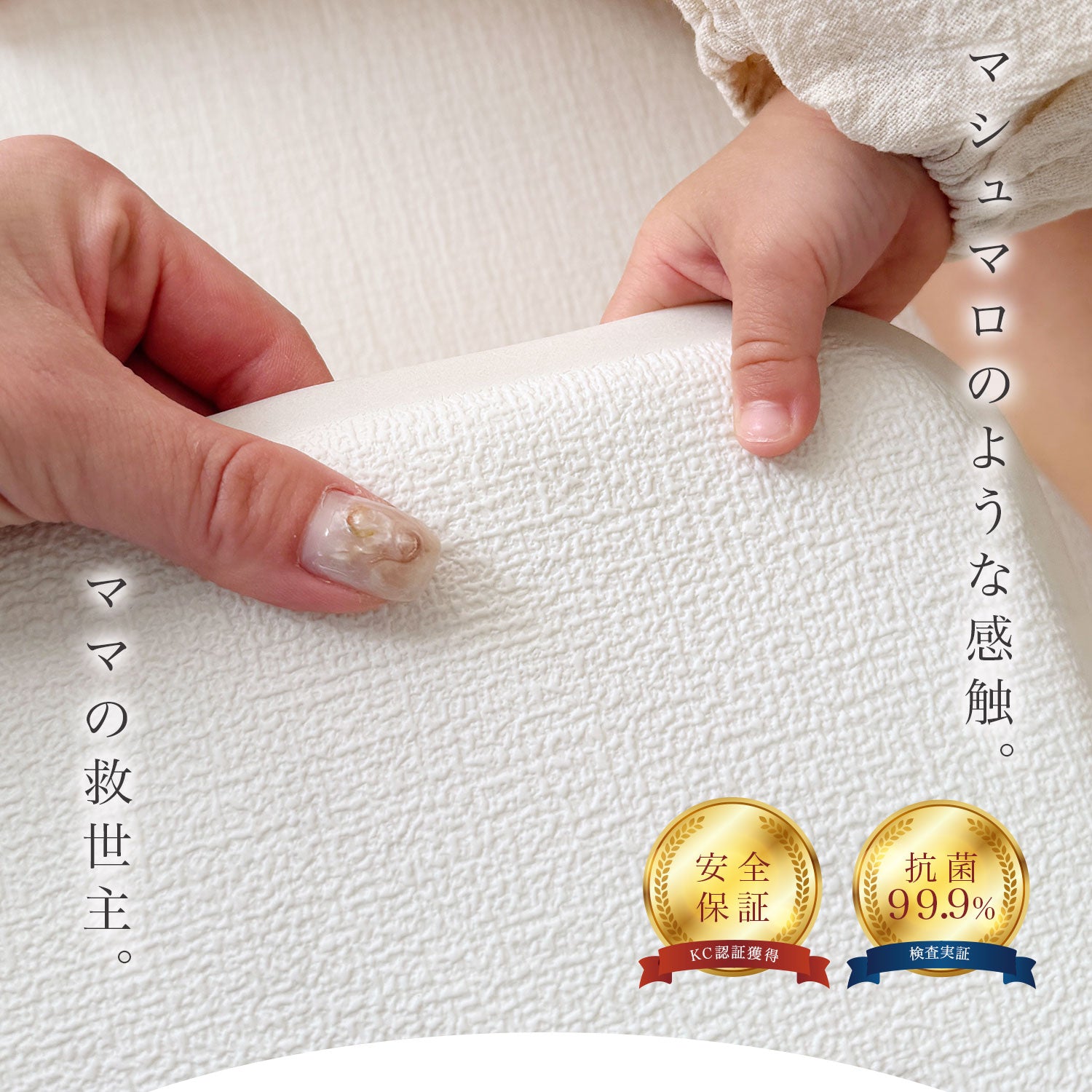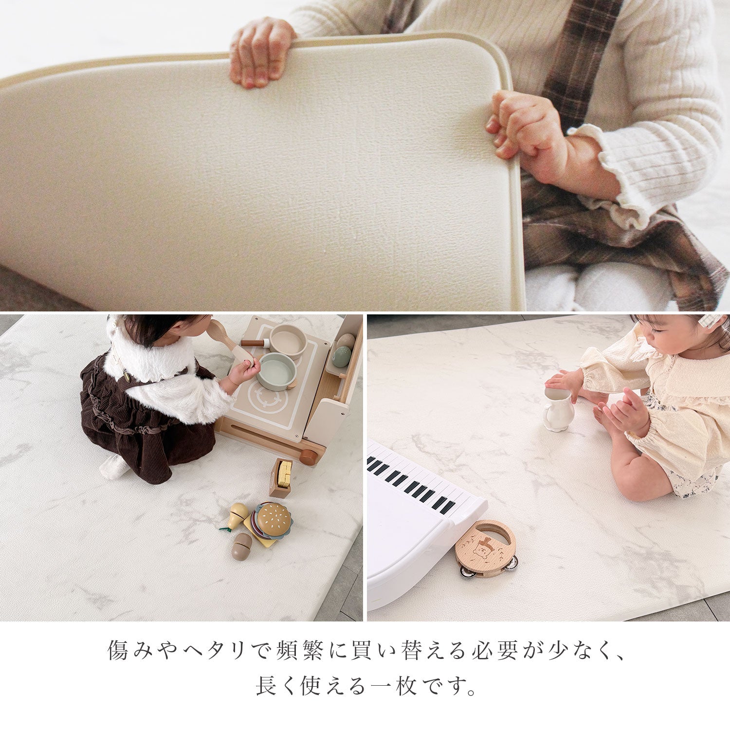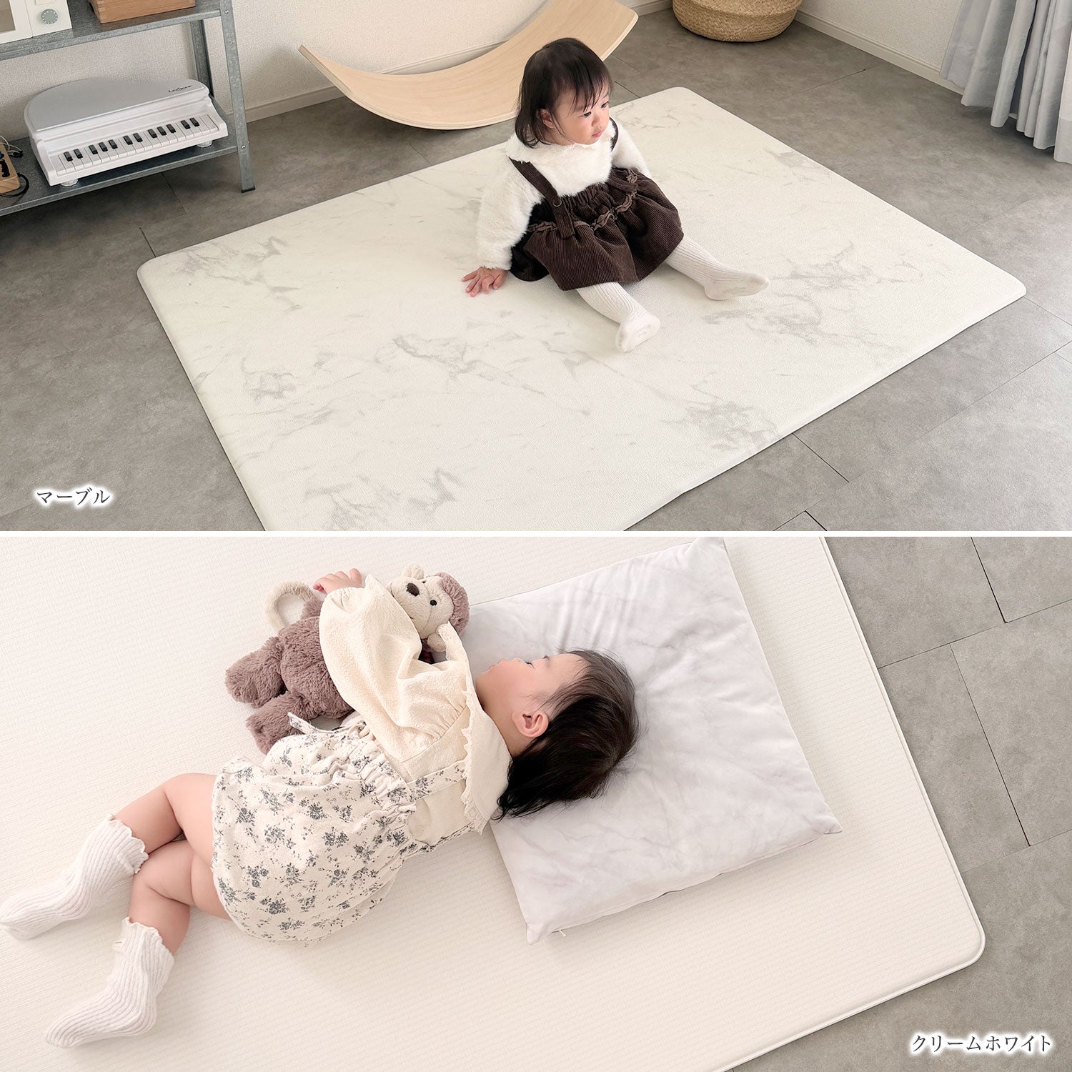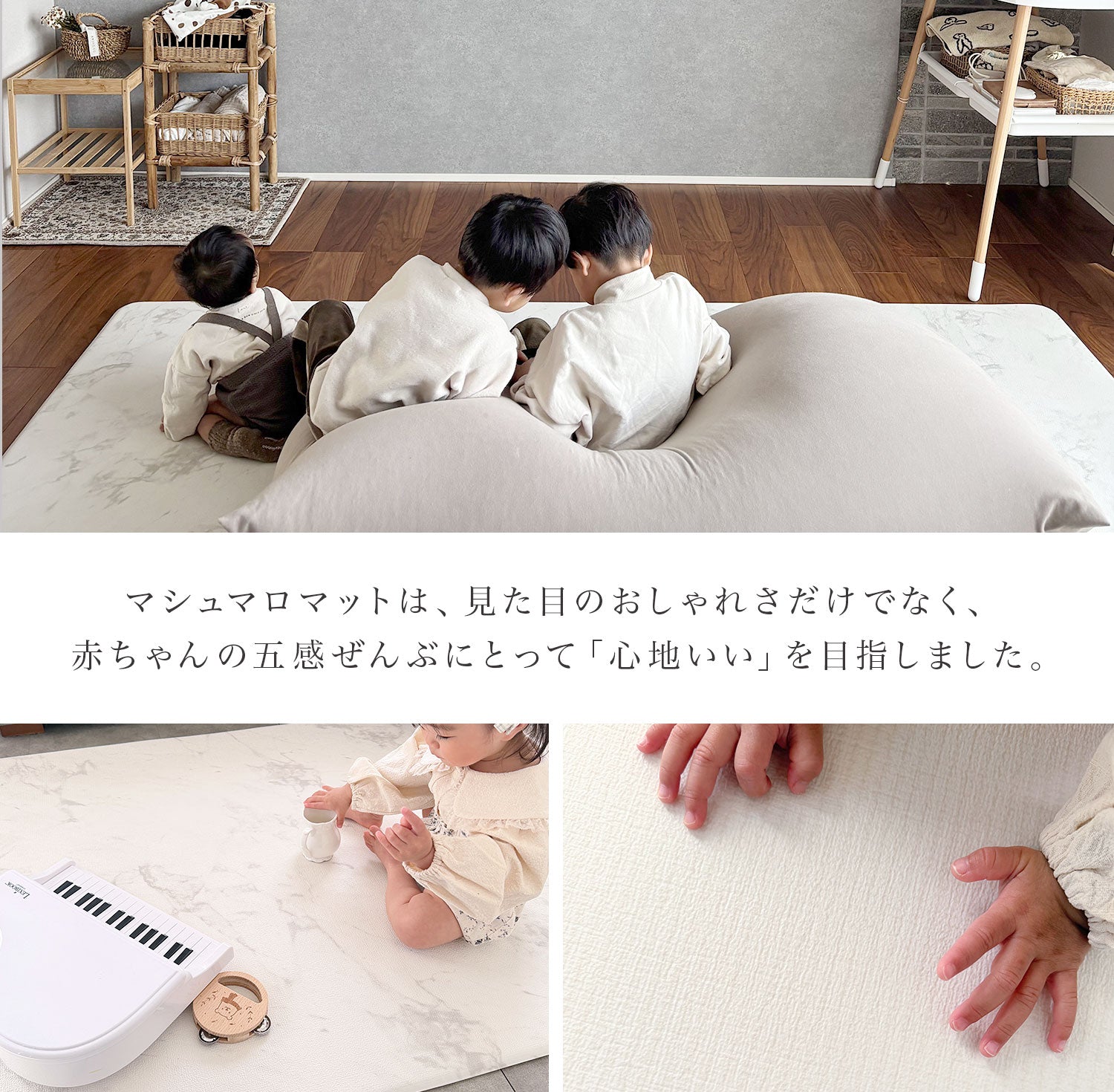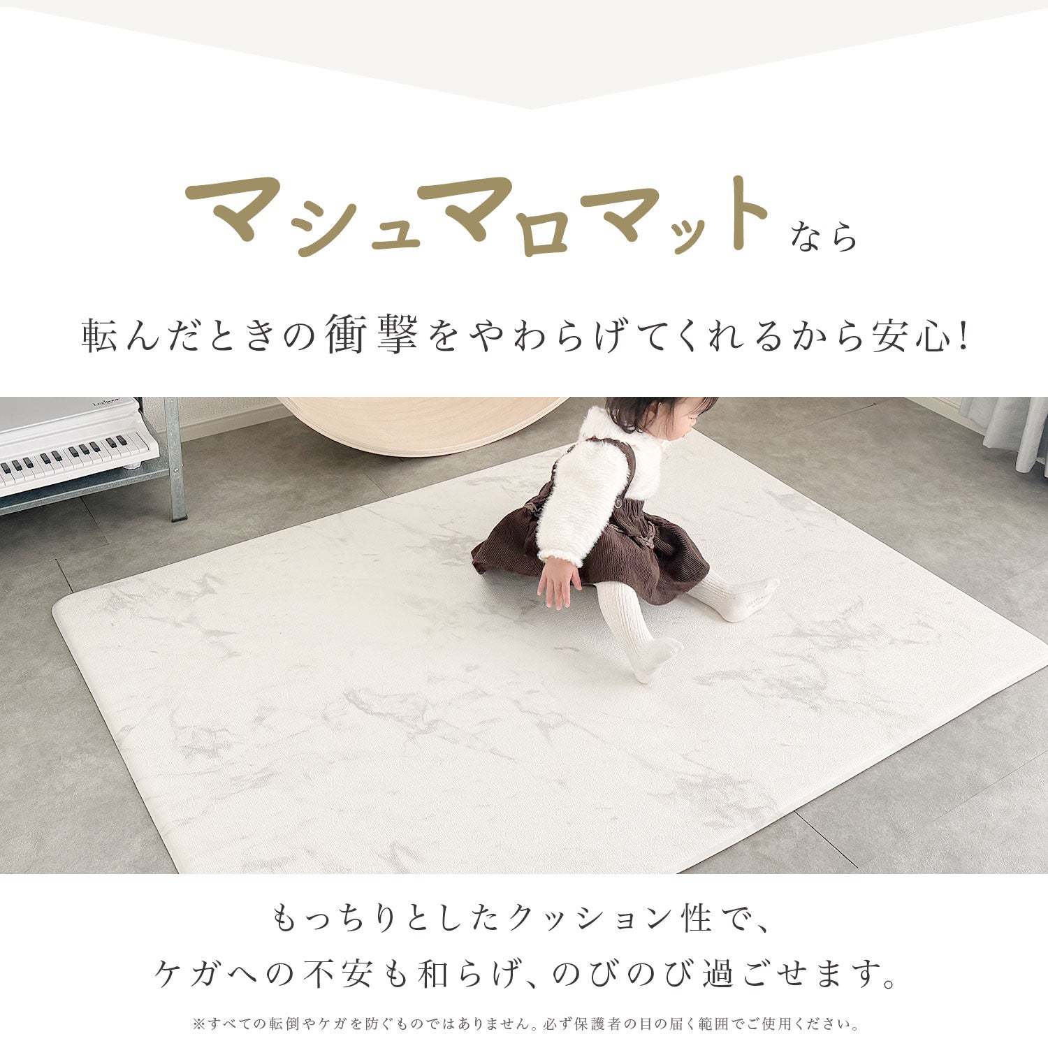 | 【マシュマロのような感触でお子様のごツンを守る!マシュマロマット】 滑りやすい床の安全対策におすすめ! オールシーズン快適なもっちりマシュマロマットが新登場♪ 小さなお子様にとって、フローリングなどの滑りやすい床は関節や足腰に負担がかかり、転倒時の思わぬケガに繋がる危険があります。 ケガ防止のためにも、遊ぶスペースや活動空間にはクッション性のあるマットを敷くなど安全対策を行うことが大切です。 マシュマロマットは、優れた密着力ですべり止め効果も抜群♪ 程よい厚みながら高密度のPVCがしっかり衝撃を吸収! 丈夫で破れにくく、復元力も◎ 足腰に負担をかけず、もっちりとした気持ちの良い踏み心地です。 また、側面まで100%防水でお手入れも簡単♪ 床との段差が少ないので、掃除機楽々・お掃除ロボもOK! リバーシブルで使えるので、マットも長持ちし模様替えにも◎ お部屋に自然と馴染むナチュラルなデザイン3色に 大人気のマーブルを裏面に使いました。 その日の気分やインテリア、模様替えに合わせて柄を変えれます。 使いやすい2種類のサイズからお好きなものをお選びいただけます。 使い勝手抜群のマットです。 ぜひお部屋の安全対策にご活用ください^^ |