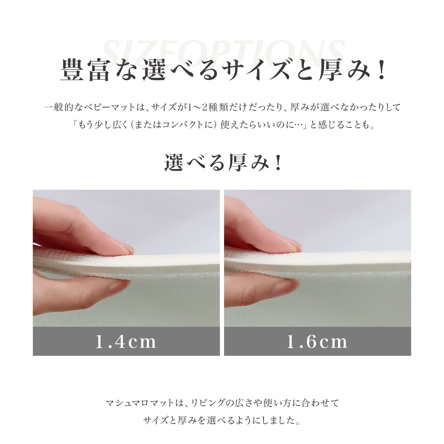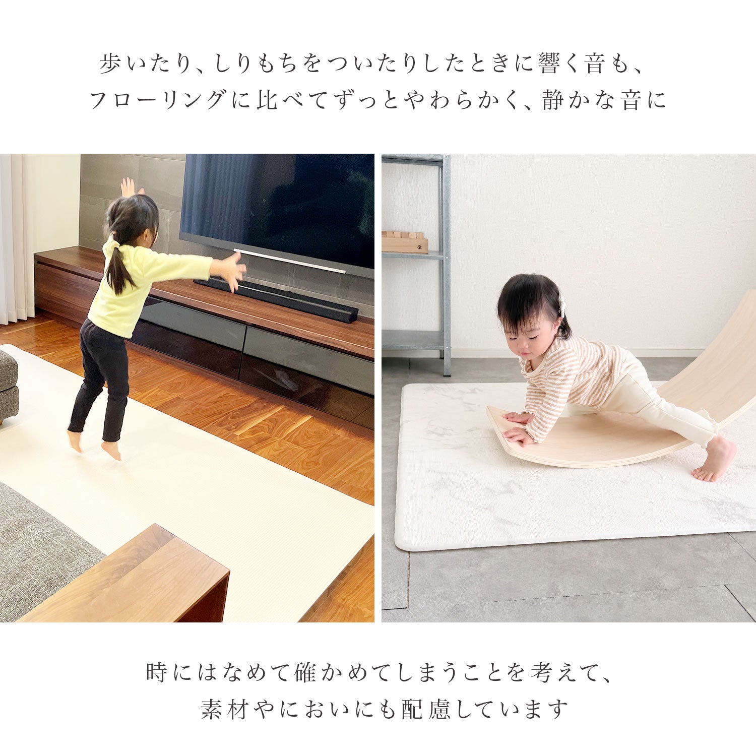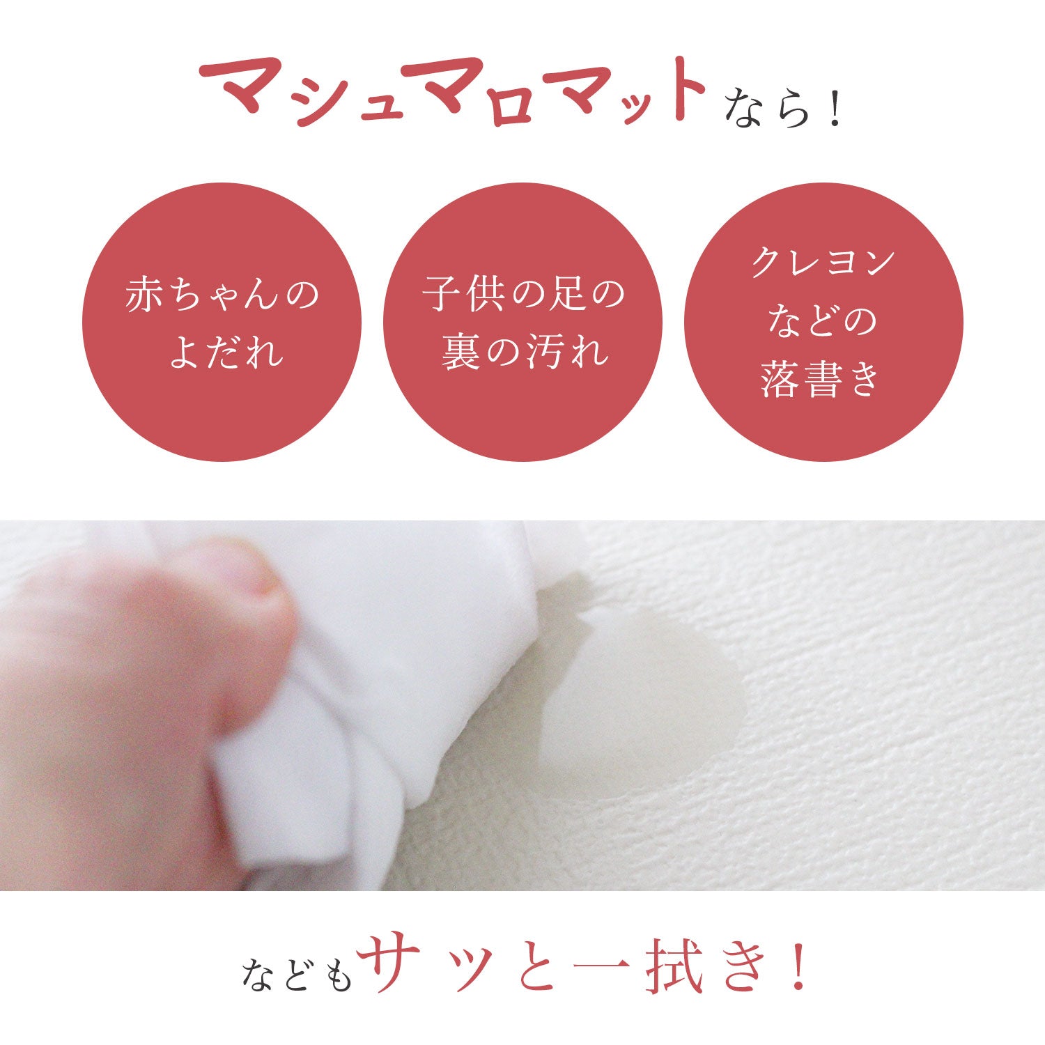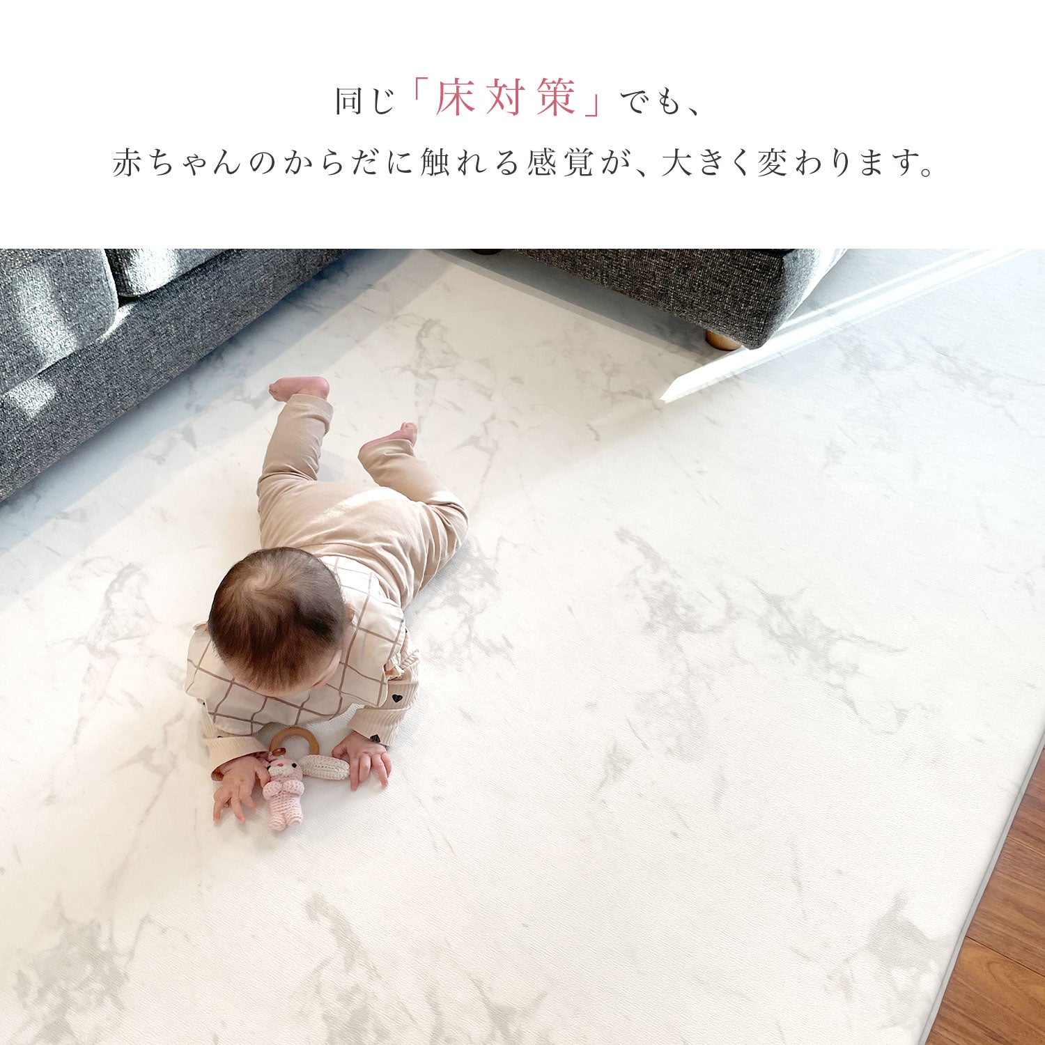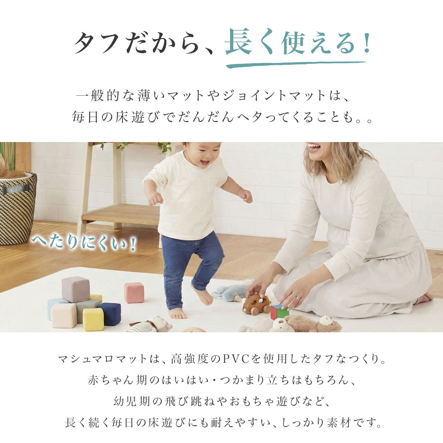 | 【マシュマロのような感触でお子様のごツンを守る!マシュマロマット】 滑りやすい床の安全対策におすすめ! オールシーズン快適なもっちりマシュマロマットが新登場♪ 小さなお子様にとって、フローリングなどの滑りやすい床は関節や足腰に負担がかかり、転倒時の思わぬケガに繋がる危険があります。 ケガ防止のためにも、遊ぶスペースや活動空間にはクッション性のあるマットを敷くなど安全対策を行うことが大切です。 マシュマロマットは、優れた密着力ですべり止め効果も抜群♪ 程よい厚みながら高密度のPVCがしっかり衝撃を吸収! 丈夫で破れにくく、復元力も◎ 足腰に負担をかけず、もっちりとした気持ちの良い踏み心地です。 また、側面まで100%防水でお手入れも簡単♪ 床との段差が少ないので、掃除機楽々・お掃除ロボもOK! リバーシブルで使えるので、マットも長持ちし模様替えにも◎ お部屋に自然と馴染むナチュラルなデザイン3色に 大人気のマーブルを裏面に使いました。 その日の気分やインテリア、模様替えに合わせて柄を変えれます。 使いやすい2種類のサイズからお好きなものをお選びいただけます。 使い勝手抜群のマットです。 ぜひお部屋の安全対策にご活用ください^^ |