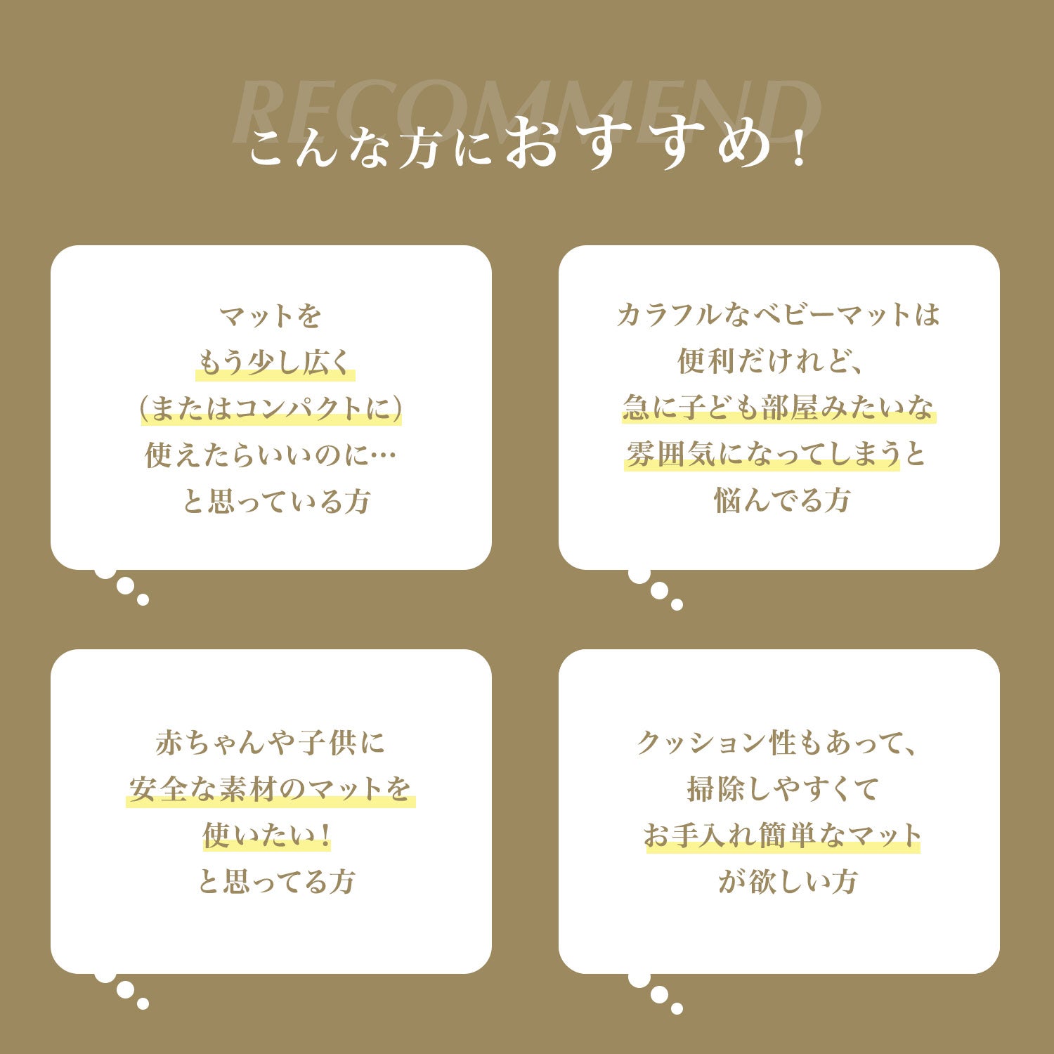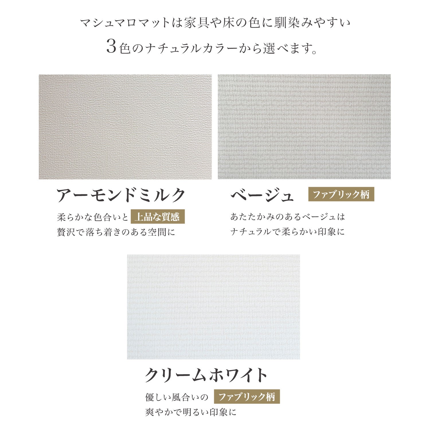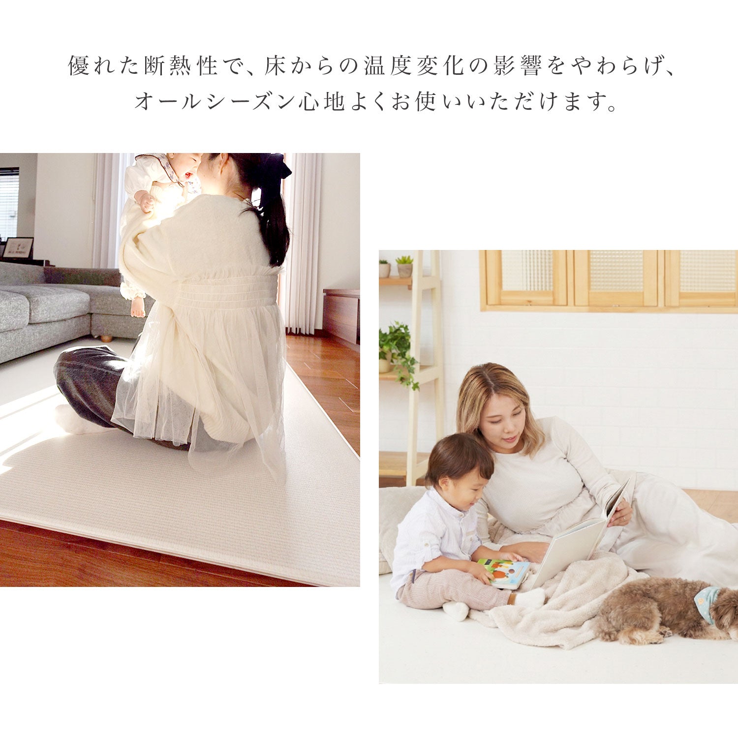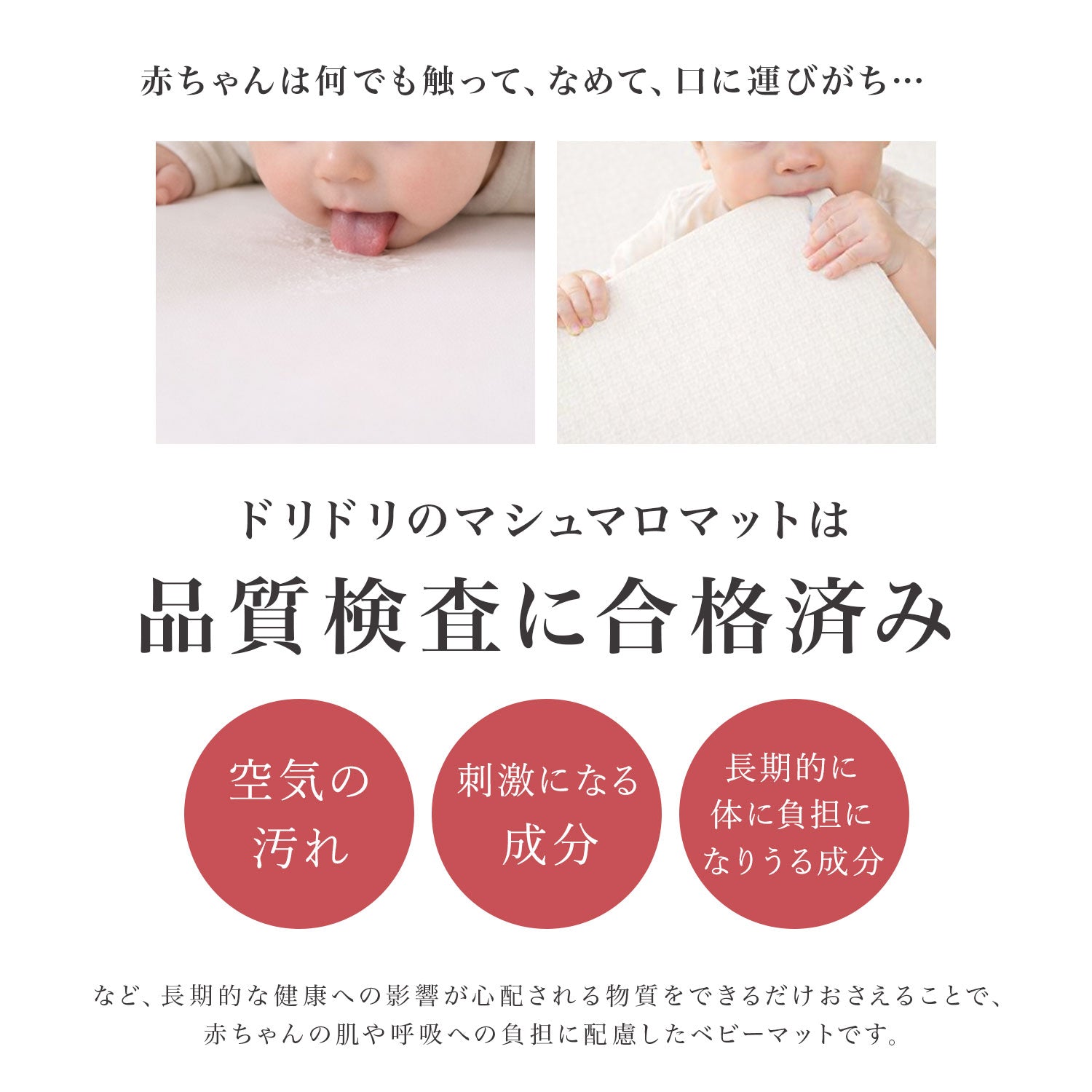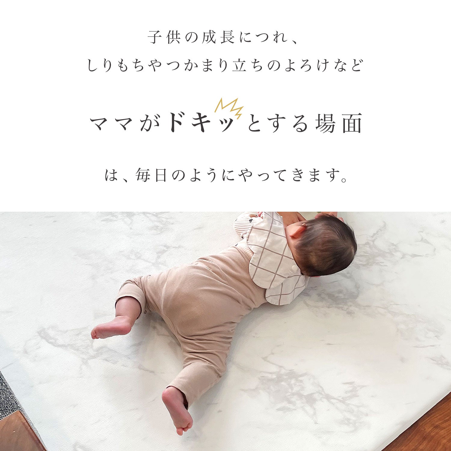 | 【マシュマロのような感触でお子様のごツンを守る!マシュマロマット】 滑りやすい床の安全対策におすすめ! オールシーズン快適なもっちりマシュマロマットが新登場♪ 小さなお子様にとって、フローリングなどの滑りやすい床は関節や足腰に負担がかかり、転倒時の思わぬケガに繋がる危険があります。 ケガ防止のためにも、遊ぶスペースや活動空間にはクッション性のあるマットを敷くなど安全対策を行うことが大切です。 マシュマロマットは、優れた密着力ですべり止め効果も抜群♪ 程よい厚みながら高密度のPVCがしっかり衝撃を吸収! 丈夫で破れにくく、復元力も◎ 足腰に負担をかけず、もっちりとした気持ちの良い踏み心地です。 また、側面まで100%防水でお手入れも簡単♪ 床との段差が少ないので、掃除機楽々・お掃除ロボもOK! リバーシブルで使えるので、マットも長持ちし模様替えにも◎ お部屋に自然と馴染むナチュラルなデザイン3色に 大人気のマーブルを裏面に使いました。 その日の気分やインテリア、模様替えに合わせて柄を変えれます。 使いやすい2種類のサイズからお好きなものをお選びいただけます。 使い勝手抜群のマットです。 ぜひお部屋の安全対策にご活用ください^^ |