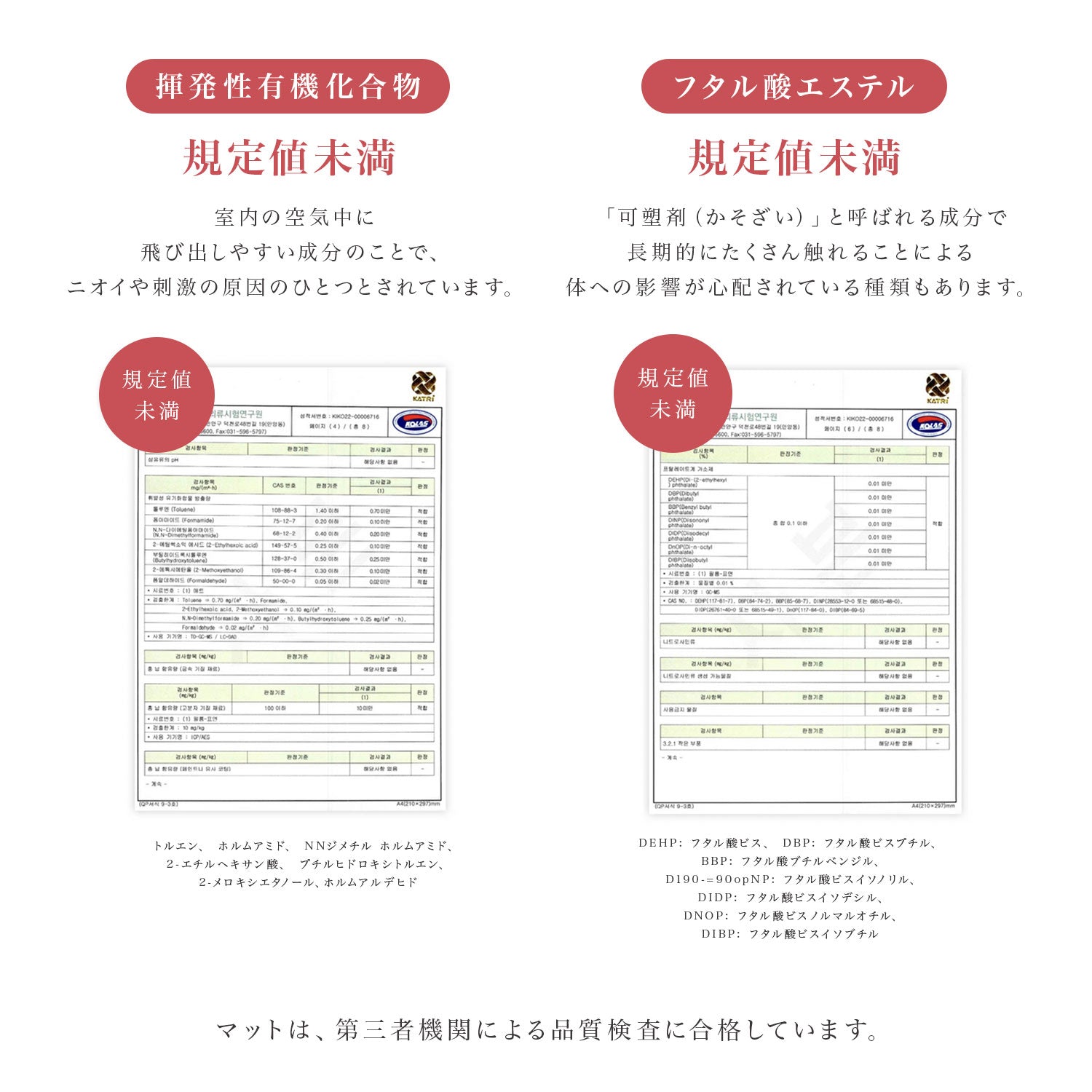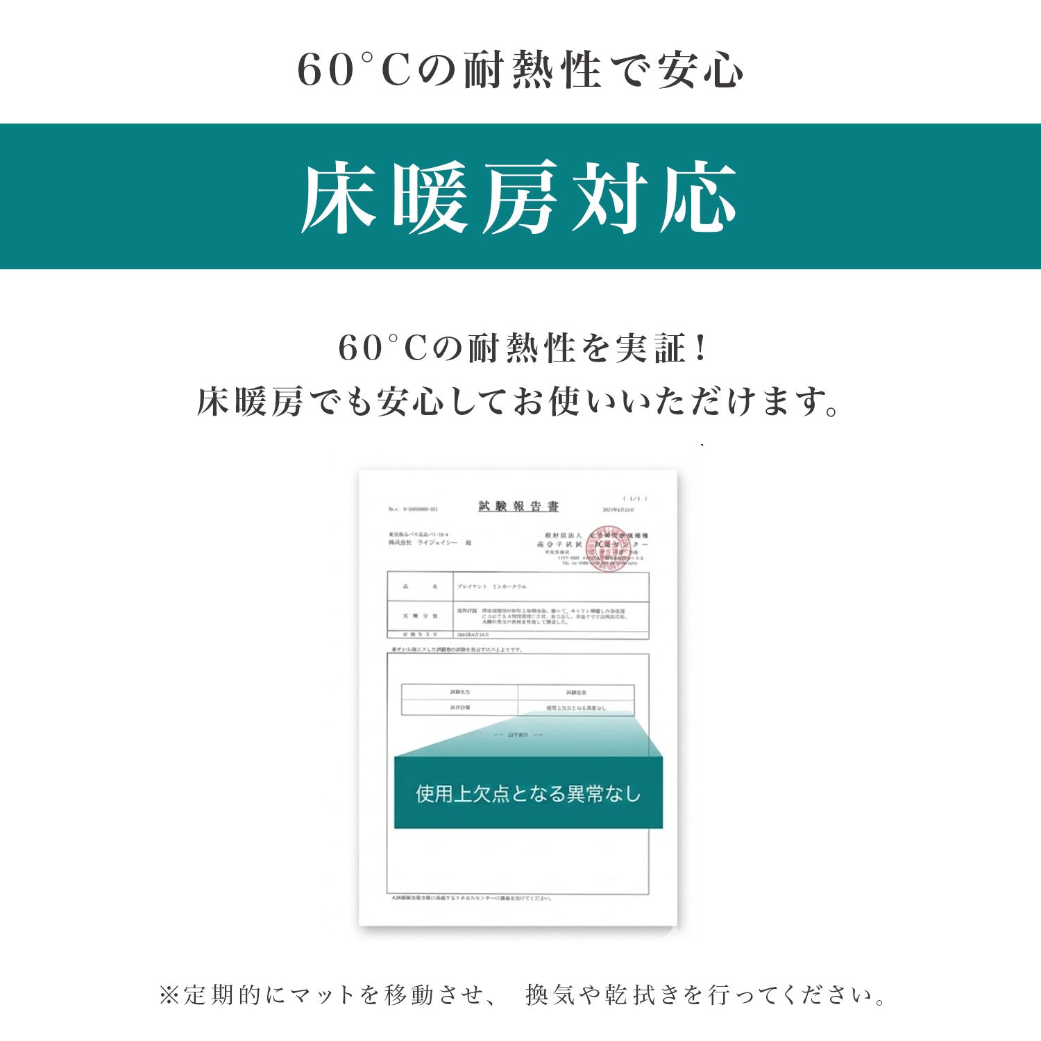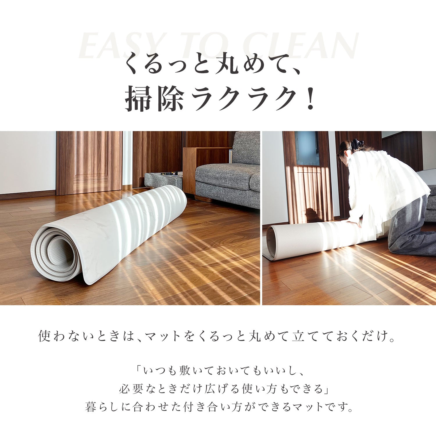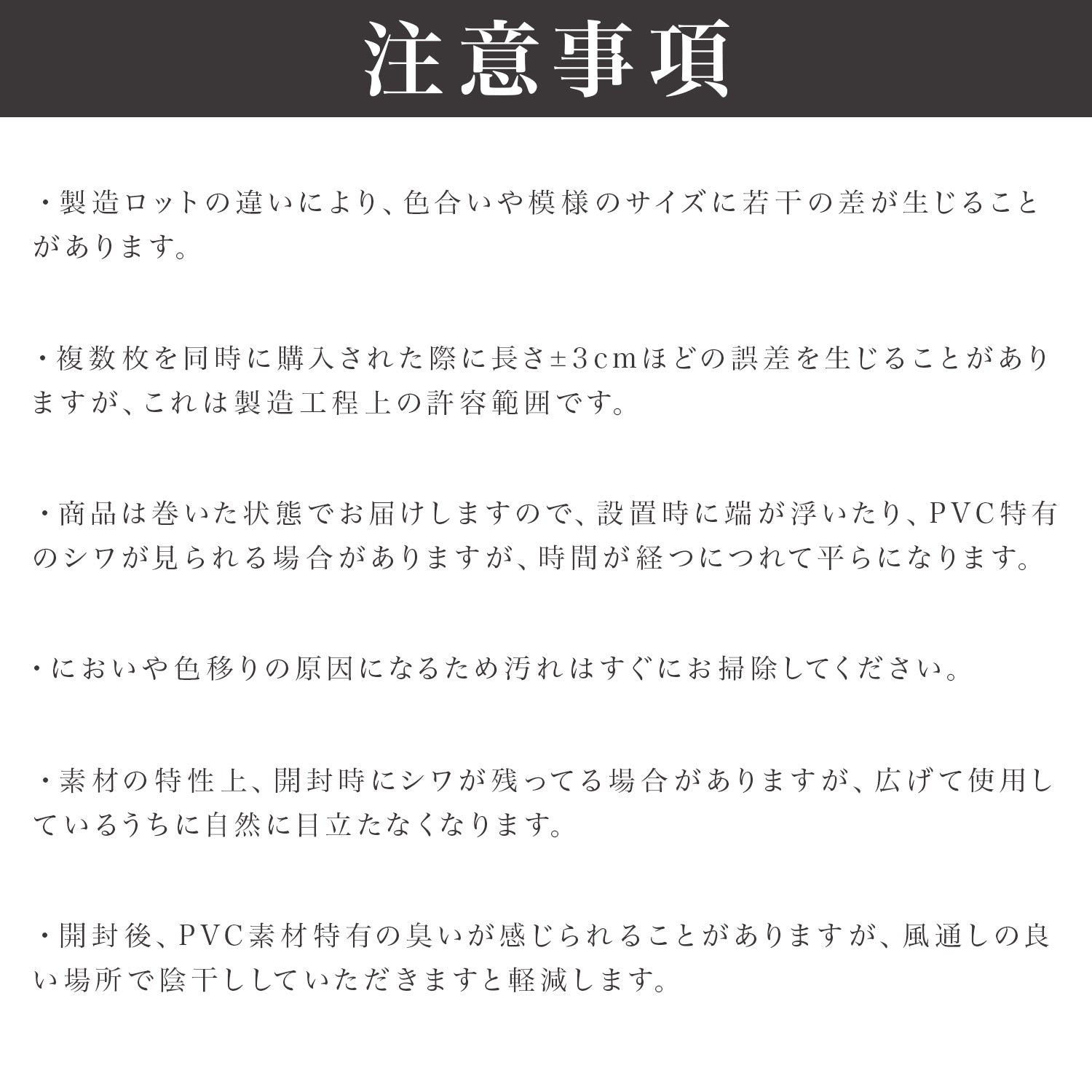 | ご使用上の注意 | ・製造時期により色、質感など個体差が生じる場合がございます。予めご了承ください。 ・においや色移りの原因になるため、汚れはすぐにお掃除してください。色味の強いものは、すぐに拭いてもシミや変色の恐れがありますので、十分ご注意ください。 ・素材の特性上、開封時シワが残っている場合がありますが、広げて使用しているうちに自然と目立たなくなります。 ・開封後においが気になる場合は、風通しの良い場所で陰干ししていただきますと軽減します。 ・マットは伸縮するため±3cm程度の誤差が生じる場合がございます。 ・長時間直射日光が当たる場所ではマットが変色する恐れがございますので、カーテン等での日よけを推奨いたします。 ・変色やカビが発生しないよう、定期的に裏返し湿気を逃がしてください。 ・変形の原因となりますので、火気や高温にご注意ください。 ・爪のお手入れ不足や同じ箇所へ継続的に力が加わった場合等は破損の可能性がありますので十分ご注意ください。 ・説明書は含まれておりません。 ・海外からの輸入品のため梱包のダンボールに汚れがある場合がございます。また通関の際、中身の確認のため一度商品が開けられている場合がございます。予めご了承下さい。 ※上記の警告・注意をご理解、ご了承いただいた上、正しくご使用ください。 誤った設置とご使用方法により生じた事故につきましては、弊社は責任を負いません。 |